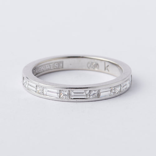 A classic wedding band created in white gold and set with alternating princess cut and baguette cut white diamonds set to halfway.