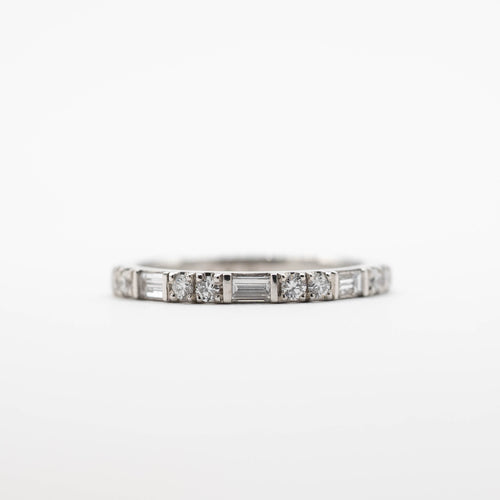 Baguette and round brilliant cut white diamonds feature in alternating settings. A modern band that can hold it's own or pair beautifully with a Deco-inspired Simon West design.