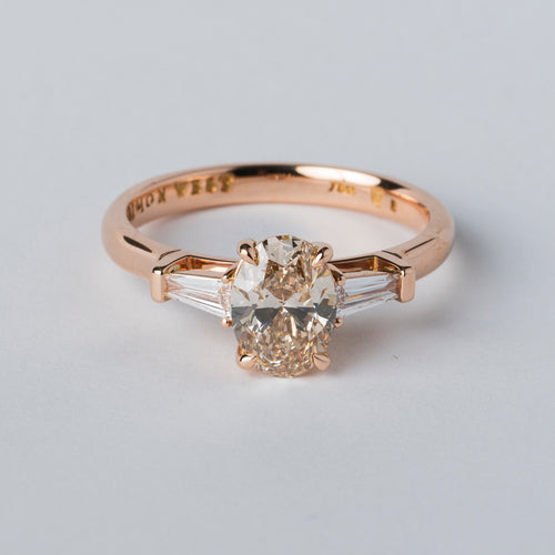 This exquisite Lygon Ring features an Australian Argyle diamond nestled in a rose gold setting with white diamonds. Its brilliant oval cut catches the light in stunning fashion, making it an effortlessly luxurious engagement ring.