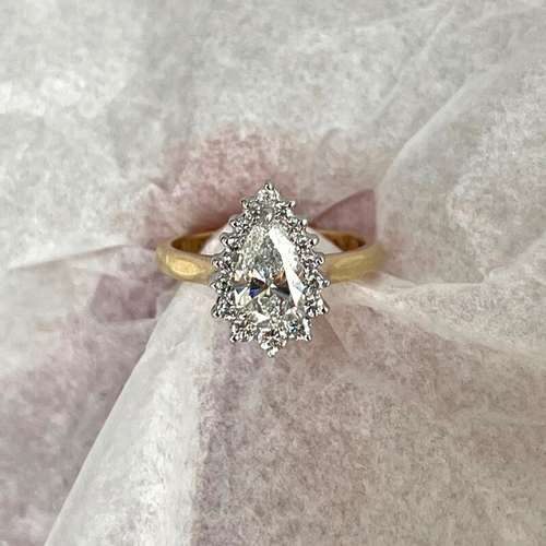 A pretty pear cut diamond surrounded by a halo of glittering round diamonds. This elegant and unique ring is a stand out piece.